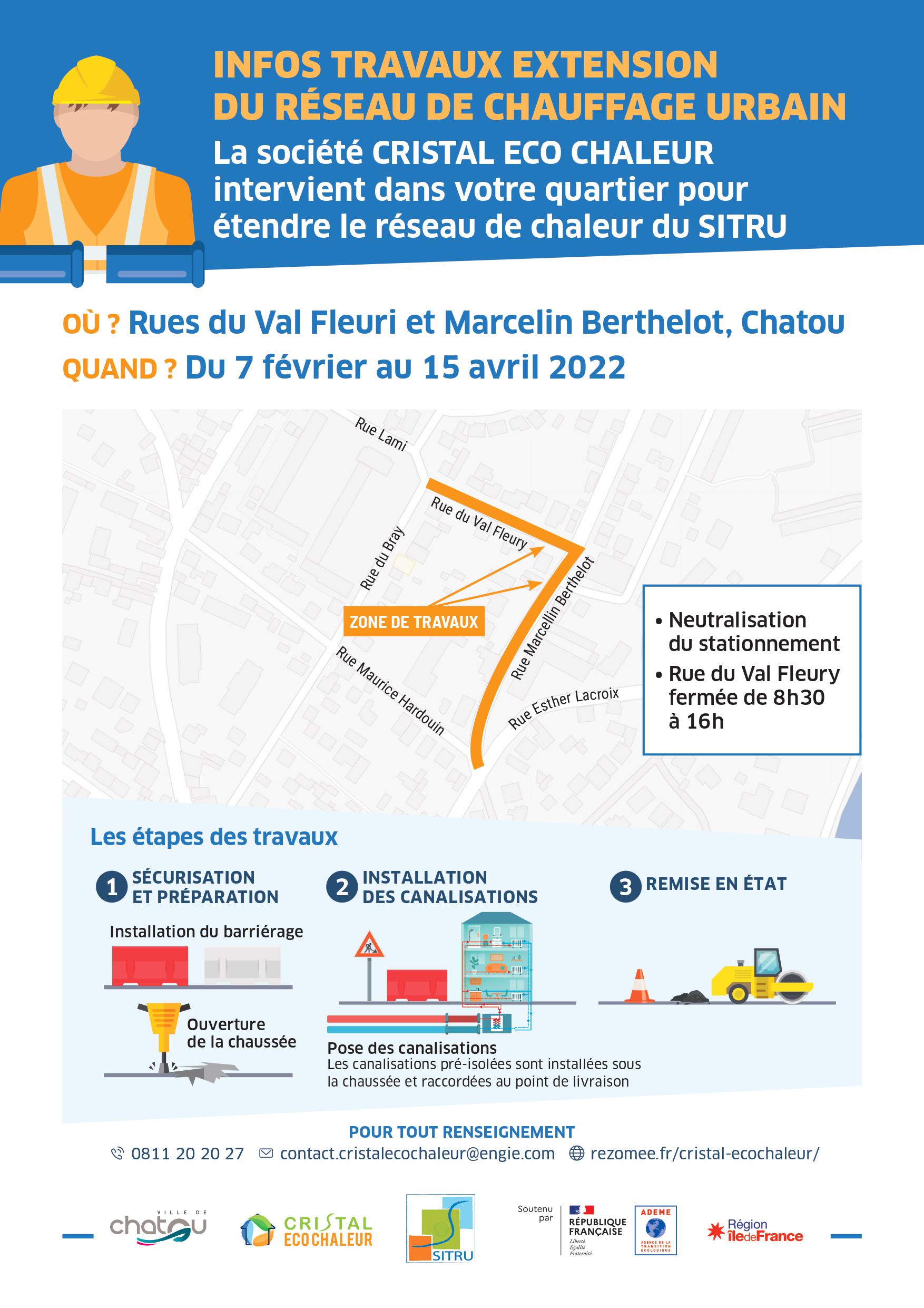 Dans le cadre de l'extension du réseau de chaleur du SITRU, des travaux seront réalisés sur la rue du Val Fleuri et la rue Marcelin Berthelot du 07 février au 15 avril 2022