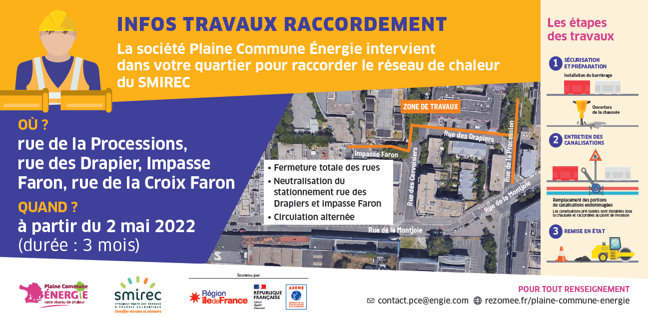 Saint-Denis, L’Ile-Saint-Denis, Pierrefitte, Stains et Aubervilliers - [Saint-Denis] Travaux de raccordement - Rue de la Procession, Rue des Drapiers, Impasse Faron, Rue de la croix Faron