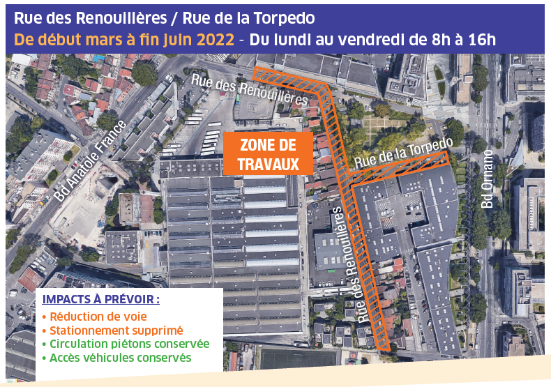 Les travaux de raccordement au réseau de chaleur Plaine Commune Énergie des rues de la Torpedo et des Renouillères à Saint-Denis, initialement prévus de début mars à fin mai 2022, seront prolongés jusqu’à fin juin 2022.